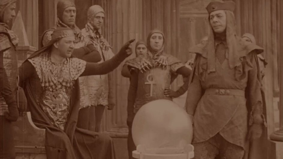 And so in 1913, when the buzz from the success of the play had died out, Charles Hawtrey decided to re-ignite the flame through the movies. Since Hawtrey knew nothing about making movies, he hired writer/director Wallett Waller (real name Ernest John Waller) to re-write it for the silent screen, as well as direct it. Waller added to the script a first scene, absent in the play, where we see a Martian ruler (R. Crompton) and a retinue, all acting in very broad theatrical manner, declaring that the Martian Ramiel (E. Holman Clarke) has broken one of the laws of Mars, and as punishment he must be sent to Earth to redeem himself by turning a selfish man into a generous man.