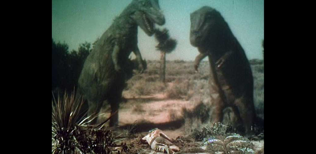 One should remember that this was still the days before Godzilla (1954, review), and that the Japanese special effects team struggled — with legendary results — to find a way to make a man in a rubber suit work as a convincing giant lizard. One problem was that it was difficult to make rubber suits that were durable, easy to mold and light enough for the actors to wear. Another was that any suits made out of rubber would be impossibly hot. To my knowledge, only one film prior to Unknown Island ever used a full-body dinosaur suit; One Million B.C. from 1940, and in that film the allosaurus in question is only ever seen at a glance. In Unknown Island they are seen frequently, in long, long takes. The brontosauruses and the dimetrodon are not very well realised, but they are perfectly adequate for a film of this type. It’s the wobbling “T-Rexes”, as they are called in the film, that make this movie show up on so many “worst monster movies” lists. In fact, the dinosaurs in question are modelled on ceratusauruses, which were smaller than the Tyrannosaurus Rex, and had a horn on their noses. It’s clear that the actors can’t walk very well in the suits, and have to sway from side to side only to take tiny steps forward, giving the terrifying monsters a hilarious wobbling gait. It doesn’t help that their necks and arms aren’t very rigid, which means that as they walk, they get a certain jello-like appearance as the head and forelegs bounce from side to side. There seems to be no way to animate the arms or the mouth, so as the creatures fight, they simply wobble into each other, making them look like those people in fat-suit wrestling games you see at festivals and fairs.
