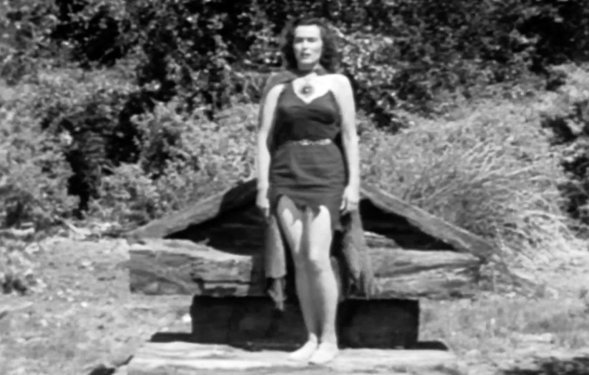 During WWII a US bomber crew is shot down over the Pacific. After an emergency landing in the ocean, four crewmen survive for eight days in an emergency raft, before floating ashore on an uncharted island. These are: pilot and hero Steve (Mikel Conrad), the insecure Ed with an Oedipus complex (Mark Lowell), the macho Andy (Morgan Jones) and the Brooklynite comic relief Benny (Richard Monahan). Here they are captured by a lost tribe of female Druids, led by high priestess Sandra (Doris Merrick), who can’t seem to decide between marrying the men or killing them. During the one-hour running time they also confront a lot stock images of Slurpasaurs from One Million B.C. (1940), as well as stock images from a volcanic eruption, also courtesy of One Million B.C. Just when the men have started to enjoy their stay among the untamed women, the “hairy men”, who previously killed off all the male druids, return for more savagery. With their guns, the US air force guys have the upper hand, but only until they run out of ammunition … The whole story is told in flashback, as the beginning of the movie sees an army doctor (Lyle Talbot) trying to shake the sole survivor (or is he?) Steve out of catatonia, so ge can tell his story to archaeologist Montgomery Pittman, who in turn is to decide whether Steve’s nightmarish experiences with the untamed Druids from out of history have actually happened or are just the ramblings of a madman.