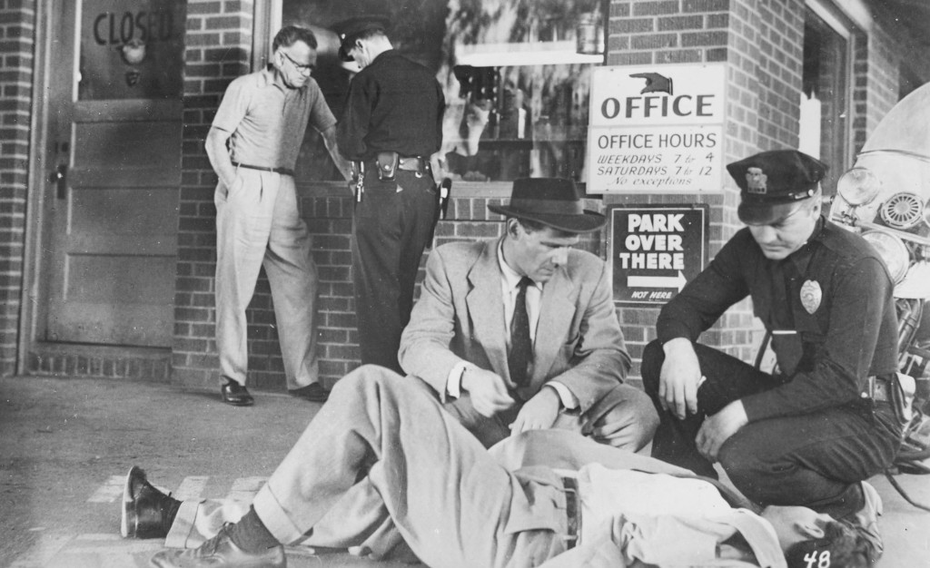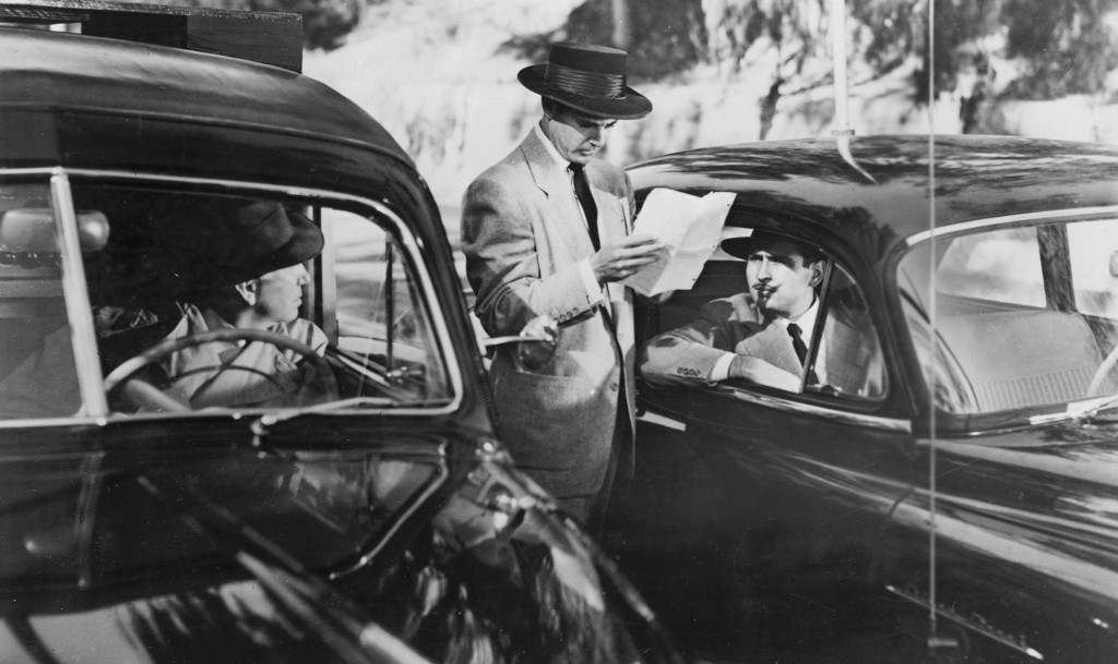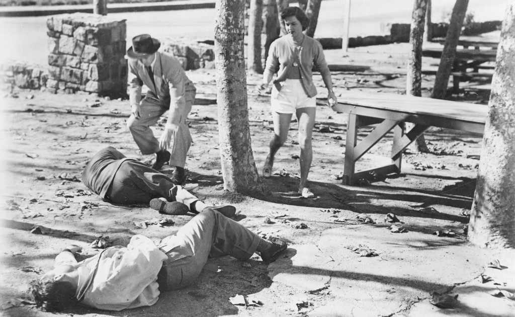 The film opens with a long stretch of US Navy and radar stock footage, much of which would reappear in director W. Lee Wilder’s next sci-fi film Killers from Space (1954, review). A voice-over explains how an unidentified flying object is observed over the west coast of USA, until it disappears over Santa Monica Beach, California. We then cut to the agents of the all-powerful Communications Commission, with its cars with big antennae on their roofs driving round and round, looking for the source of some strange radio and TV interference. They stumble upon a number of strange deaths, where witnesses claim to have seen a man in a diving suit without a face kill their friends. Communications agents Hazen (Ted Cooper), Charlie (Tom Daly) and police officer Bowers (Harry Landers) are on the case.