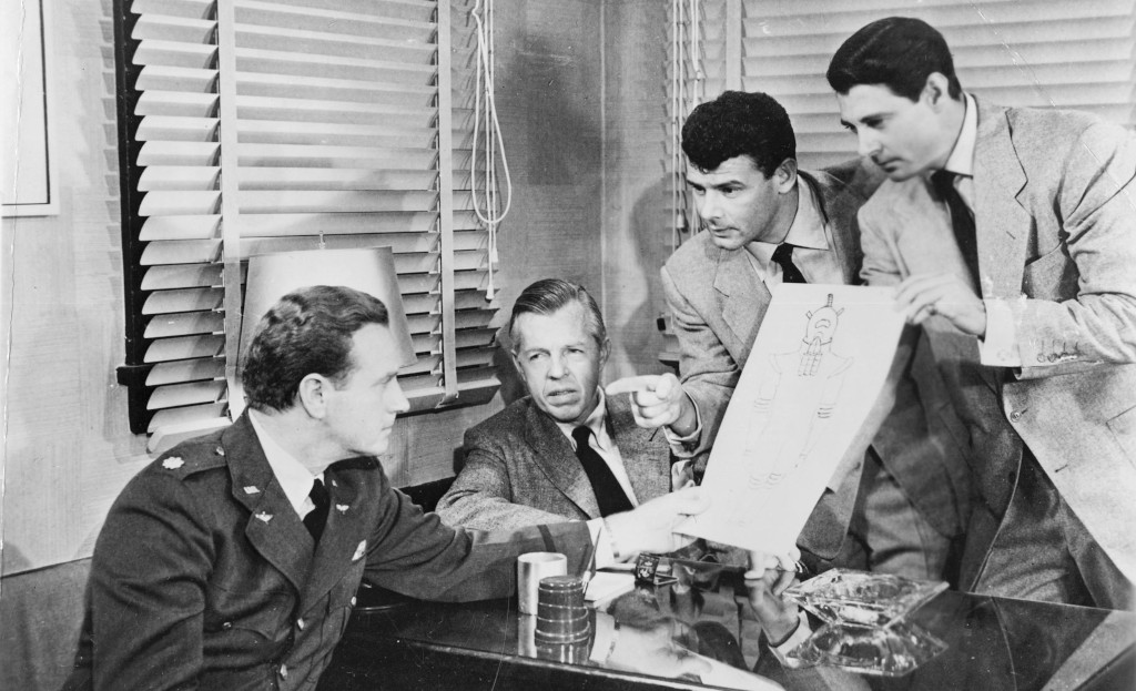 The rest of the main cast is more or less interchangeable: plain-looking middle-aged men playing flavourless roles without much conviction. The two bumbling communications agents who serve as leading men in the movie are played by bit-part actors Tom Daly and Ted Cooper. Daly was usually relegated to uncredited bit-parts in B movies, and appeared in The Man from Planet X, Captive Women (1952), Gog (1954, review) and The 27th Day (1957). One of his few more substantial roles came in Ib Melchior’s psychedelic Angry Red Planet (1958). Ted Cooper only has 10 other bit-part credits listed in IMDb.