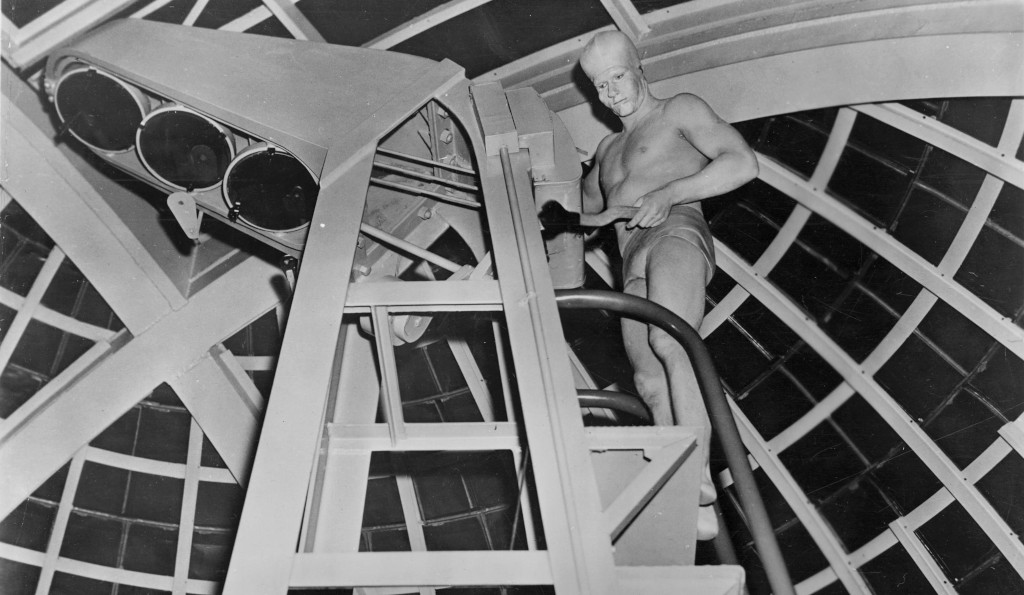 Not that the quality of the cinematographer shows in Phantom from Space – there’s really only so much you can do with the time and money involved in a production like this. I can’t find reliable numbers, but the budget can’t have been many tens of thousands of dollars. Most of it was probably spent on the visual effects, and perhaps the spacesuit, if it wasn’t a hand-me-down. There’s a lot of repetition of shots, we see the same antenna cars going round the same bends at least three or four times, the same shots of communication officers listening to their radios, and so forth. In an interview Myles Wilder said that his father usually didn’t bother to pay for sets, but shot everything on location. All shots involving offices were shot in Willie Wilder’s own office, which would account for the cramped look of all the agents and scientists sitting like packed sardines along a single wall of an office – they couldn’t fit a camera in to shoot more than one wall at a time, and probably didn’t have time for blocking and changing setups. The main part of the film is shot at the Griffith observatory.