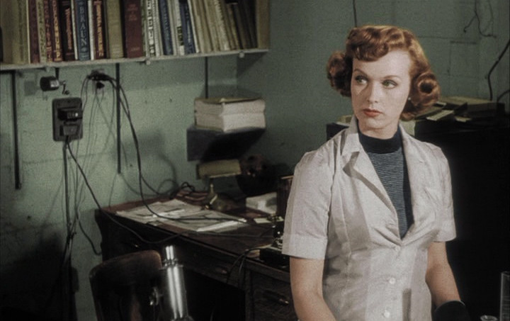 Turns out the alien in question is invisible, and when cornered in a woodshed, he simply sheds his spacesuit for the befuddled investigators to find. The suit turns out to be radioactive (but not the helmet!), and made out of some unbreakable metal alloy. The helmet contains gas lethal to humans, but the scientists figure it must be what the phantom breathes. This becomes the pivotal point in the story, as the phantom keeps coming back to the lab for some whiffs from his helmet, surprising the female scientist Barbara Randall (Noreen Nash). The scientists reason that since the alien is not breathing air, and is invisible, he is not a carbon-based life form. Further, glass is invisible, and glass is made out of silicon. Therefore, if the alien weighs the same as a duck, he floats, and is therefore A WITCH! no sorry, also made out of silicon.