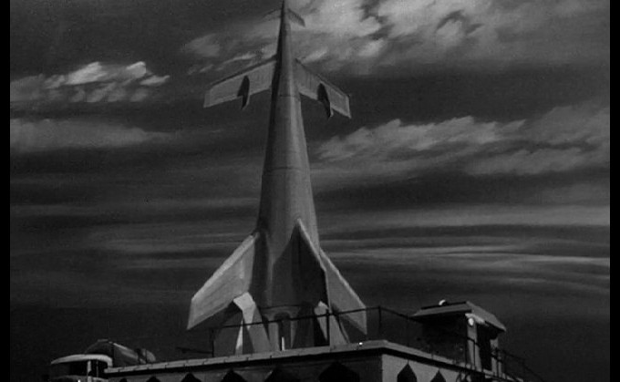 The art direction of Spaceways naturally suffers from the low budget. There’s a lot of sterile rooms with just plot-related accessories, and the science station looks a lot like a studio. Still, the ground control has a crazy amount of gauges and certainly feels more elaborate than the one depicted in The Net, which was mostly obscured by darkness in an obvious attempt at hiding the fact that it consisted of little more than a few TV monitors. The rocket looks like something out of Flash Gordon and is really only seen as a miniature or matte painting. It’s inspired by George Pal’s early space films, sleek and silvery, but has even more crazy wings. One of the most egregious gaffes of the movie is that the parked rocket and the models look absolutely nothing like the rocket in flight. When it takes off, it suddenly changes into an ordinary V2-rocket, in fact it’s the very same V2-takeoff that was used for another film, where it didn’t match the designed rocket either, Lipper Picture’s Rocketship X-M (1951). However, once you get into the cockpit it’s not all the bad, and some effort clearly went into designing the thing. It looks as if Hammer scoured London for all the gauges it could find, and a nice touch of old European style is the teak-lined dashboard.