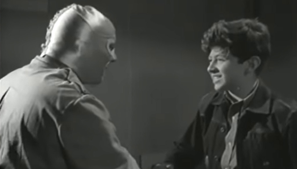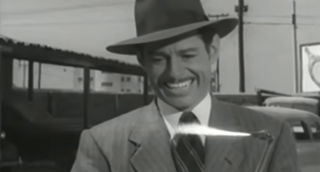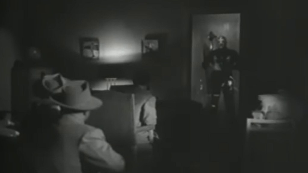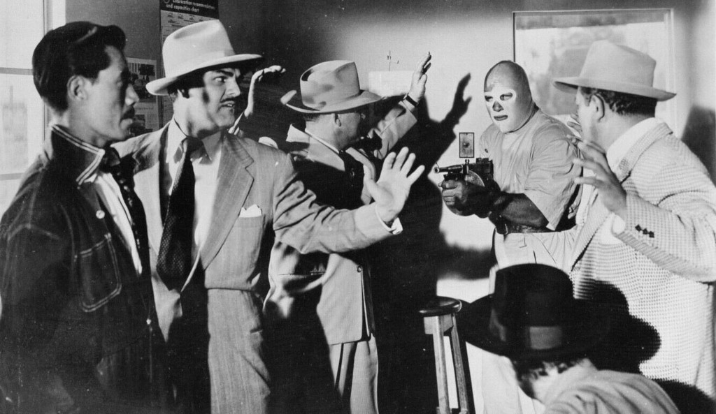 Masked master villain El Tigre (Luis Aldás) holds Mexico in the grip of terror, as he uses his death ray to control the weather, hurling storms and lightning at a petrified population. At least, he does so in the beginning and end of this 1954 movie, which seems to forget all about El Tigre’s lightning-wielding power for most of its 2-hour running time. In between, the mastermind is more of a traditional crime lord, presiding over a gang of gun-toting, fedora-wearing gangsters who do gangstery things. The leader of the street mobsters is Lobo Negro (Guillermo Hernández), who in turn takes his orders from a video screen, where yet another masked villain gives him commands — this is the titular El enmascarado de plata, or “The [Man] with the Silver Mask”, henceforth we’ll call him Silver Mask. Silver Mask, in turn takes his orders from El Tigre.