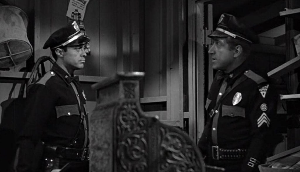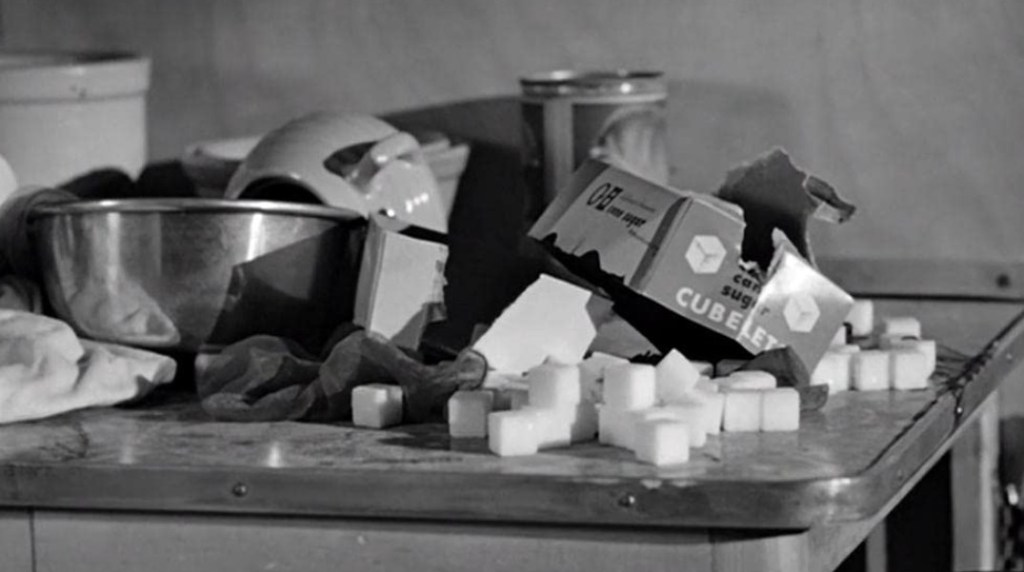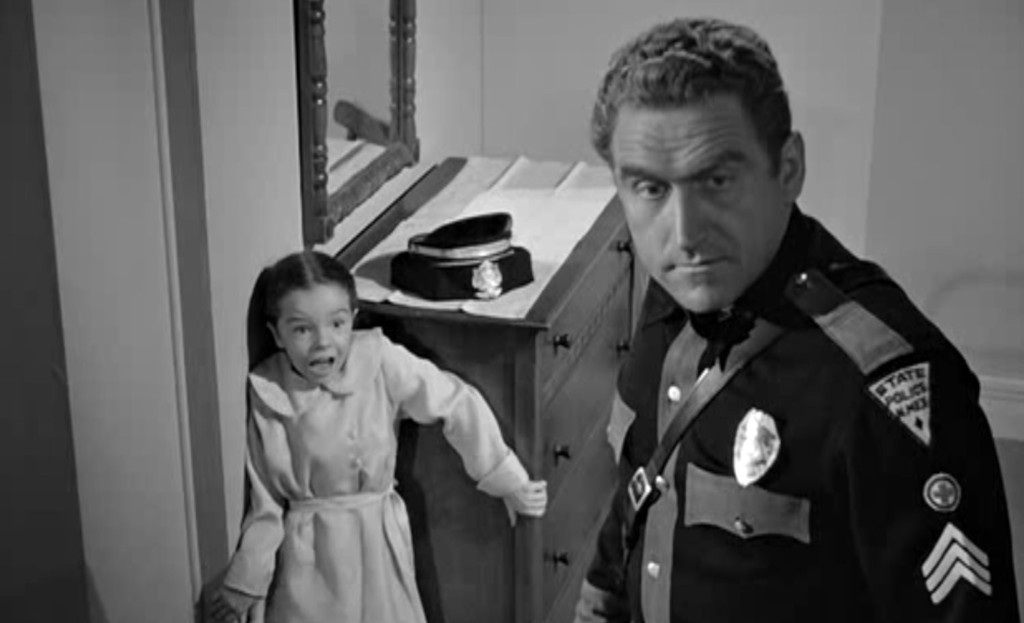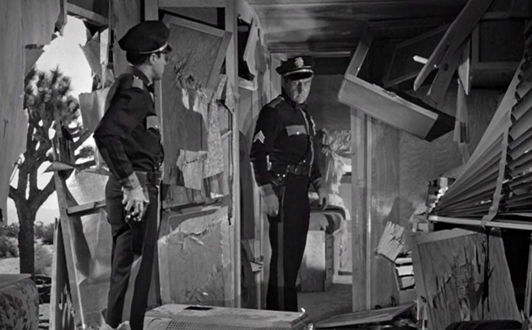 Police spot a little girl (Sandy Descher) walking alone with a broken doll in the middle of the New Mexico desert (actually the Mojave desert). As one of the police officers, Sgt. Ben Peterson (James Whitmore) tries to speak to her, she appears to be shocked into an almost catatonic state. The officers then spot a destroyed camper van and deduce that the girl must have escaped from there. The parents are nowhere to be seen, the trailer has a huge hole in the side, but nothing is taken, except for a looted package of sugar. The only clue as to the assailant is a strange large print in the sand. As the girl is loaded into an ambulance (driven by sci-fi stalwart William Schallert in a walk-on role), the officers hear an eerie, ominous chirping sound, but don’t see the girl reacting to it by sitting straight up in her stretcher.