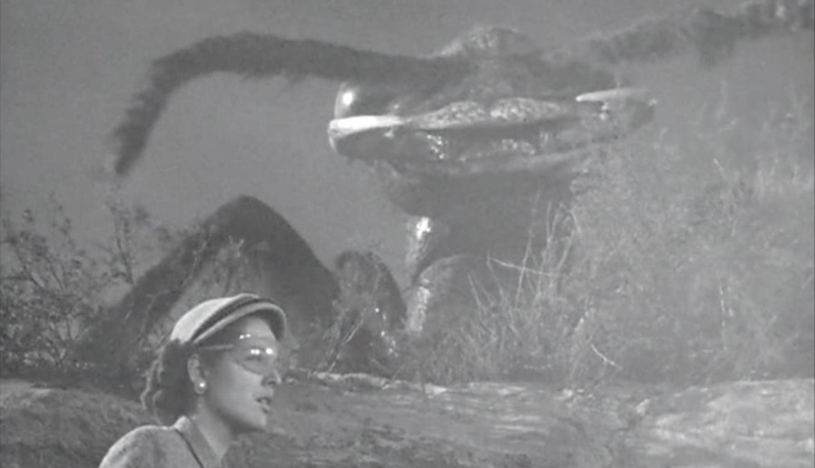 Of course the giant ants in Them! weren’t without precedent. Science fiction and horror films and serials had occasionally used spiders and lizards as rear-projected images either in lost world or prehistoric films, as monsters on other planets or as pets of mad scientists. Giant spiders were created by Jackie Coogan by manipulating their glands in Mesa of Lost Women (1953, review) and appeared on the moon in Cat-Women of the Moon (1953, review). W. Lee Wilder had his hero escape giant lizards, bugs and rodents in Phantom from Space (1953, review), but in all these cases the creepy crawlies were not much more than diversions. Giant monsters had, of course, existed since The Lost World (1925, review), and in a number of imitations, including King Kong (1933, review). The radiation-created monster appeared in a number of horror movies in the thirties and forties, usually in the form a human being (be it Karloff or Chaney), but really hit its stride with Ray Harryhausen’s stop-motion dinosaur in The Beast from 20,000 Fathoms (1953), which kicked off the second wave of monster movies.