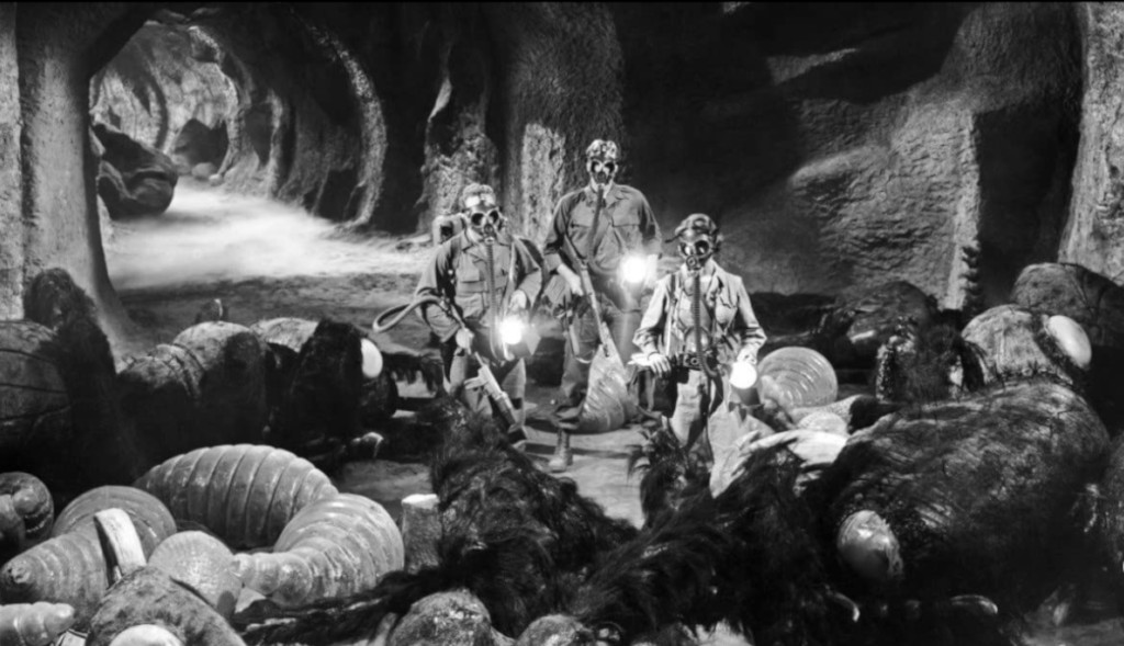 I don’t want to give too much away for those who haven’t seen the film, but in short Peterson, Graham and the Medfords team up with the military to destroy the underground ant hive in the middle of the desert, and after gassing it, the two heroes go underground into the tunnels, along with a very capable and tough Patricia Medford, walking past the giant corpses of dead ants, killing stragglers with flame throwers, and finally come upon the queen’s chamber, filled with translucent eggs, some of which have unfortunately hatched, and may have gotten out. To their dismay, they find that two of the eggs contained queen ants, who have now flown away in search of new breeding grounds. Peterson and Graham think they’re done, but Patricia snaps at them, they’re far from done: ”I said burn it! Burn everything!”