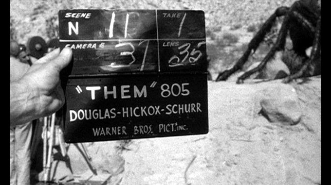 Them! 1954, USA. Directed by Gordon Douglas. Written by George Worthing Yates, Russell S. Hughes, Ted Sherdeman. Starring: James Whitmore, Edmund Gwenn, Joan Weldon, James Arness, Onslow Stevens, Sean McClory, Chris Drake, Sandy Descher, Mary Alan Hokanson, Don Shelton, Fess Parker, Olin Howland, Richard Bellis, Willis Bouchey, Richard Deacon, Ann Doran, Kenner G. Kemp, Leonard Nimoy, Jack Perrin, William Schallert, Luce Potter. Cinematography: Sidney Hickox. Music: Bronislau Kaper. Editing: Thomas Reilly. Art direction: Stanley Fleischer. Makeup: Gordon Bau. Prop construction manager (ant builder): Dick Smith. Sound: Francis J. Sheid. Stunts: Roydon Clark. Pyroeffects supervisor: Ardell Lytle. Wardrobe: Moss Mabry. Produced by David Weisbart for Warner Bros.