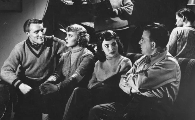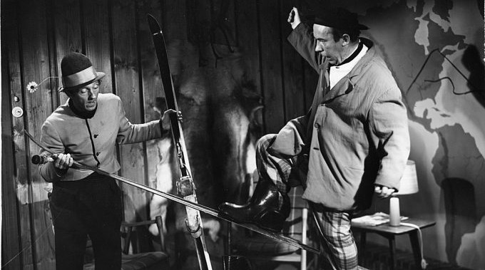 And that’s something one has to say about these movies – at least if Pekka ja Pätkä lumimiehen jäljillä is anything to go by – the visuals of the film stand head and shoulders above many American low-budget films made at the same time. Lohikoski actually tells a story through camera work and images. In one scene we’re introduced to the ladies on a sewing committee by having the camera focus solely on their cups as Justiina pours them coffee. The camera follows the the snout of the pot from one cup to the next and at each pause the lady whose cup is filled says a line. Beautiful work! In other instances Lohikoski wildly swings the camera around, for example in the scene where we are introduced to the mess in Pekka’s apartment in the beginning of the movie. Lohikoski uses bold one-shot zooms in a Hitchcockian manner, and clever editing to reveal surprises. The visual comedy is the one that works best in this movie, and compensates for the lame puns and the contrived slapstick which mainly consists of people falling over.