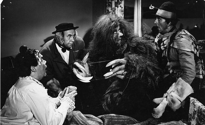 But most of all, there are some really exciting and well-filmed skiing scenes, for the most part involving the actual actors, worthy of a minor James Bond movie. Interspersed with lots of slapstick and physical comedy on skis by our intrepid trio of main characters. After a few failed attempts, lots and lots of end-over falling in the snow, they finally manage to lure out the snowman with the help of Justiina’s generously applied perfume and her petticoat. However, instead of catching the beast, Pekka and Pätkä faint in horror. The robust Justiina is not the one to faint, as a matter of fact she is quite receptive to the handsome, hairy hunk’s amorous proposals, and happily hops on her skis to follow him towards the horizon. As Pekka and Pätkä come to, and realise that Justiina is gone, they assume that she has been eaten. Heartbroken, they return to the ski lodge, where they find quite a surprise: Justiina kissing the snowman in their room! Not only that, she has taught him to perform a number of chores, like shining shoes and untangling yarn. Overjoyed, the three then drug the snowman and wrap him in a rug, and take him back to Helsinki in order to collect their reward. But the snowman is slowly realising that being Justiina’s lover is a lot more work than play, and he may have other plans for his future …