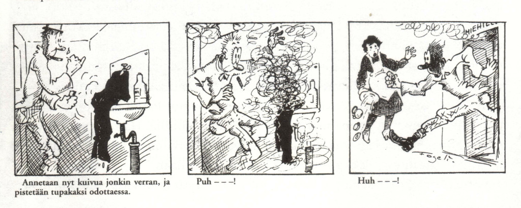 The origins of Pekka and Pätkä lie in the comic strip Pekka Puupää, created by Swedish-speaking Finn Ola Fogelberg, originally under the pseudonym Fogeli, in 1925. After his death in 1952, his work was continued by his daughter Toto Fogelberg-Kaila, who created new strips all the way to 1975, making Pekka Puupää the longest running Finnish comic in history. The strips appeared in the widely circulated magazines of the Progressive Consumer’s Co-operative Elanto, one of the largest organisations for consumer-owned grocery stores, shops and retailers, with connections to the socialist movement. Originally the comic was more of an inside joke, describing the trials and tribulations of a young man from the countryside moving to the Finnish capital of Helsinki to work in Elanto’s marketing department. The strips were often more or less propaganda for the consumers’ co-operatives, as in one famous strip where Pekka gets beaten by his wife for shopping at the nearer, privately owned, grocery store to avoid the rain, instead of walking the extra distance to the consumer-owned store. However, in the thirties Fogelberg moved Pekka to a fictional rural town, and the comic became more of a general humorous comic strip, dealing with different mundane and domestic situations. In the strips, the often unemployed Pekka would sometimes try and fail to cope in different professions, giving the filmmakers their angle for how to make the Pekka and Pätkä films.
