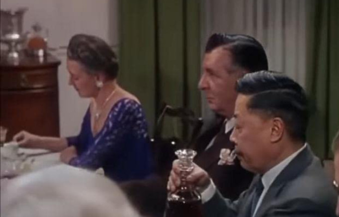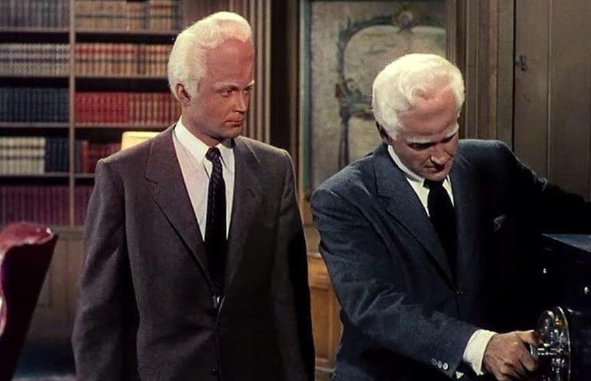 Jeff Morrow steals every scene he is in, and not only because it is impossible not to look at his bright white hair. The hair, he says, was so bright that they had problems with it registering only as a white blob on film. They tried dimming the lighting, but that made him look orange in his make-up. The solution was that the hair stylist had to carefully prepare all the white wigs every day so that they would have waves in them to create some subtle shading. The makeup is very good, the high brows do lend themselves to parody if one is in the mood, but they are not too outlandish, and rather tastefully done. Had there only been one character in the film with such a makeup, one might even have harboured the idea that he simply had some defect. But of course, as soon as the second white-haired, knob-browed character shows up, the audience is in on the gag.