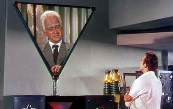 The film and the book follow each other fairly closely during the first half of the film. Genius electrical engineer and former WWII pilot Dr. Cal Meacham (Rex Reason) and his colleague Joe Wilson (Robert Nichols) receive a new electrical condenser from a strange company simply called Electronic Service – Unit 16. Shaped as a small red bead, it can take over 30 000 volts before breaking. Later they receive a strange catalogue printed on some sort of flexible metal sheets, describing how to build something called an ”interocitor”. They don’t know what an interocitor does, but Meacham is determined to build one, and the parts arrive on cue. Once built, the interocitor turns out to be a machine with a large triangular screen, that promptly lights up when the thing is completed (oh, and it has lasers, too). A strange man appears on the screen, congratulating Meacham for passing his test. The man, called Dr. Warren in the book and Exeter (Jeff Morrow) in the film, offers Meacham a job with a group of scientists called The Peace Engineers. Once the video conference is over, the machine self-destructs, along with the manual.