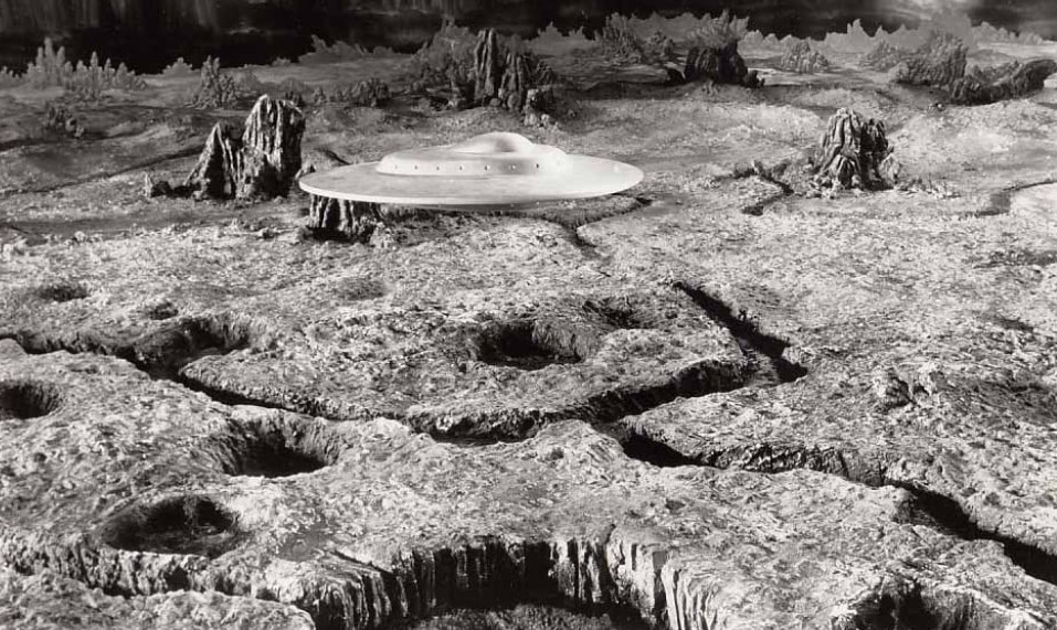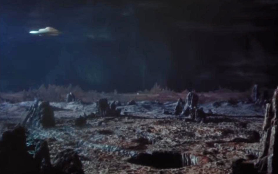 This must be one of the most inspired sci-fi designs of the fifties, and some the best miniature landscapes on screen after the lavish European science fiction movies of the twenties and thirties. They sure don’t fool anyone as far as realism is concerned, but boy, are they beautiful to look at. Unfortunately some of the magic is ruined by the UFO docking area, which is simply a miniature foreground and a very unrealistic matte painting in the back. However, the actors are very well composited into the shot. Add to this the constant fireworks of flaming meteorites and explosions, some done on the miniatures, some matted into the frame, and This Island Earth makes for one of the best-looking special effects film of the fifties, narrowly edged out from the top spot by The War of the Worlds, Forbidden Planet, and perhaps one or two other films.. A shout-out should also go to the set decorators, double Oscar winner Russell A. Gausman and only the second woman to win an Oscar for best production design, Julia Heron, who shared the award with Gausman for Spartacus (1960).