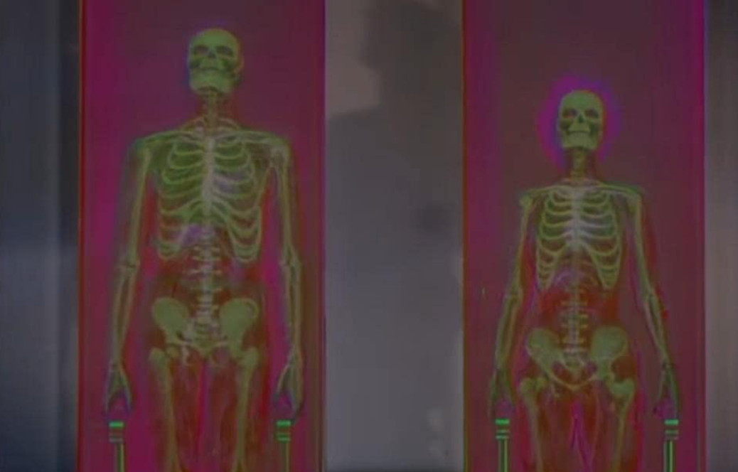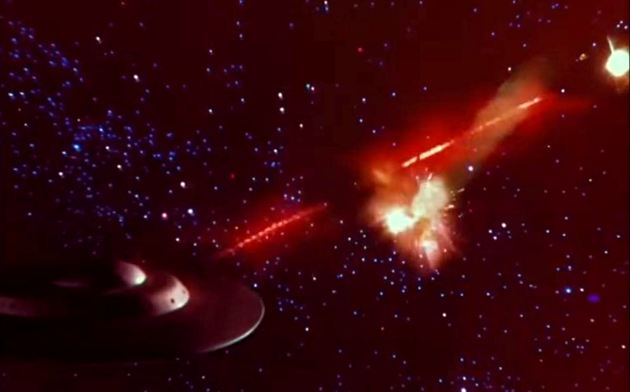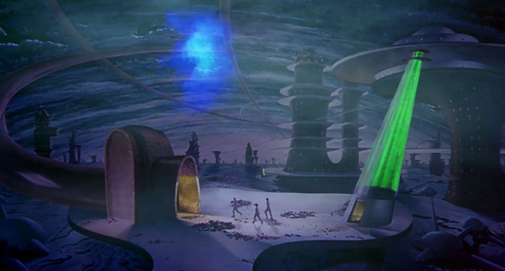 The optical and visual effects are, to be honest, a bit uneven, but mostly good. There’s only one particular moment whith a jarring amount of bluescreen colour leakage. For the most part the travelling mattes are well done, and the composite work is splendid. A memorable scene is where Meacham and Adams are disintegrated and reassembled in the tubes, disappearing before our eyes, layer by layer; first we see veins, then muscles and finally the skeletons. This is a fairly simple lap-dissolve, as used in a number of invisible man films, but it is beautifully executed, especially since it’s in colour. The matte work is largely superb, with the exception of that one unrealistic shot. Stars have probably never looked as good in a space film – there is a real depth to outer space, and its is also probably the best-looking Earth put on screen at that time – not to mention the wonderful way on which Metaluna was rendered from far away. I can’t wrap my head around how they did the effects for that shot.