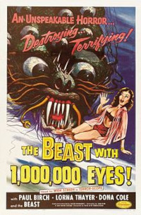 The Beast with a Million Eyes. 1955, USA. Directed by David Kramarsky, Lou Place, Roger Corman. Written by Tom Filer. Starring: Paul Birch, Lorna Thayer, Dona Cole, Dick Sargent, Leonard Tarver, Bruce Whitmore, Chester Conklin. Cinematography: Everett Baker, Floyd Crosby. Editing: Jack Killifer. Art direction: Albert S. Ruddy. Special effects & monster design: Paul Blaisdell. Special effects assistant: Forrest Ackerman. Produced by David Kramarsky & Samuel Z. Arkoff for American Releasing Company. Executive producer: Roger Corman.
