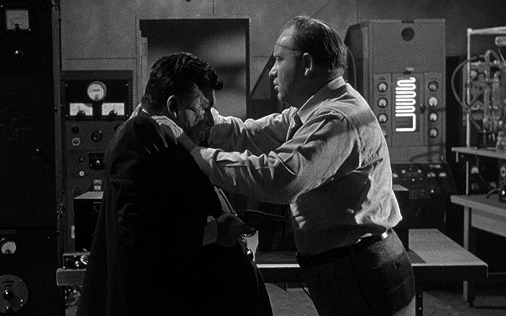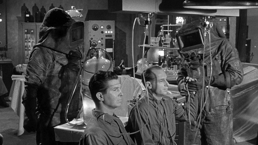 But whatever style and atmosphere Cahn creates for a few select shots is often swept away in the next scene, and the overall feeling of this movie is that of a forties serial. While the director works well within the confines of the production, it still has a clear shoestring feel to it. The squibs and a few small explosions are basically all the special effects that the budget can muster, but on the other hand Cahn doesn’t even try to pull off effects that he knows wouldn’t look good. There’s no credited makeup artist on the roster, and it shows, since the zombies’ surgery scars are highly unconvincing, and look like something out of a comic book. Columbia’s long-time art director Paul Palmentola does what he can on the budget, and there’s a certain added realism created by the fact that the production team has gone to some lengths to actually portray the hazards of radiation. Buchanan and Steigg wear proper radiation suits and the lab is not only lead-lined, but it also requires the duo to go through a quarantine corridor, the sort which would later become staple in biohazard movies. Less convincing is perhaps that Steigg himself has become so radioactive that the police can more or less follow his trail with Geiger counters, and still it seems to have no ill effect on him.
