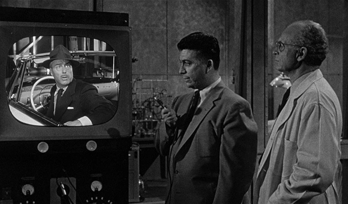 Being an editor, Cahn knew very well how to get by with a minimum amount of shots and edits, which meant he often kept the camera rolling for whole scenes without a single cut, even following actors from one room to another. But he also knew these scenes needed some energy, so he would have his actors change position, sit down, stand up, pace around to create a more dynamic feel. These are the sort of simple yet effective tricks that many lesser directors of shoestring-budget movies didn’t get. That’s why so many low-budget films feel like an endless muddle of static talking heads. You seldom get this feeling in Creature with the Atom Brain, although the shooting schedule clearly took its toll even on Cahn, and much of the setup is static and uninteresting. Cahn lights well, giving the film more depth and atmosphere, in the few instances he actually has time to do so. The opening shot of a zombie approaching on a street, in complete darkness, lit only from the back by a few street lamps, is wonderful. He also makes good use of POV cameras, giving the audience a zombie point of view – and Buchanan’s as he watches what the zombie sees through a monitor.