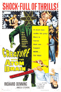 Creature with the Atom Brain (1955, USA). Directed by Edward L. Cahn. Written by Curt Siodmak. Starring: Richard Denning, Angela Stevens, S. John Launer, Michael Granger, Gregory Gaye, Linda Bennett, Tristram Coffin, Harry Lauter, Larry J. Blake, Charles Evans, Pierre Watkin, Chuck Hicks, Charles Horvath, Nelson Leigh. Cinematography: Fred Jackman Jr. Editing: Aaron Stell. Art direction: Paul Palmentola. Set decoration: Sidney Clifford. Sound: J.S. Westmoreland. Produced by Sam Katzman for Clover Productions.