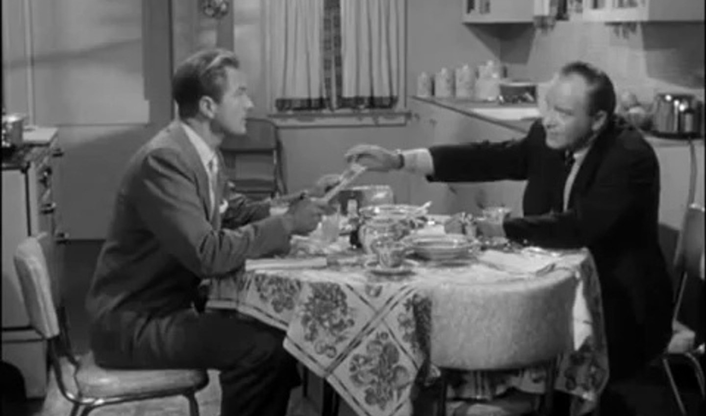 One thing that runs like a thread through all of Siodmak’s scripts is heart and humanity. Siodmak always had a deep sympathy for his characters, and tried to root the fantastic events that were unfolding in an emotional reality. Siodmak often made his heroes family men, and took the time to show their wives, their friends and their children for the audience to get a sense of what they were fighting to protect, not only what they were fighting to destroy. In Creature with the Atom Brain the bad guy isn’t the scientist creating the zombies, but the criminal using them. Siodmak goes out of his way to create scenes of affection between Mr. and Mrs. Walker, and even points out that Denning’s character can be a bit of a jerk to his wife sometimes, but still a loving husband and father. The wife’s fears and questions form a part of the narrative, not to speak of the friendship between Mr. Walker and his good friend and colleague, and ”Uncle Dave’s” and the daughter Penny’s wonderfully sweet relationship. Dave comes by for breakfast and feeds her porridge, while she quizzes him on why he isn’t married. All the while, the Mister is trying to engage the Missus in morning sex upstairs.