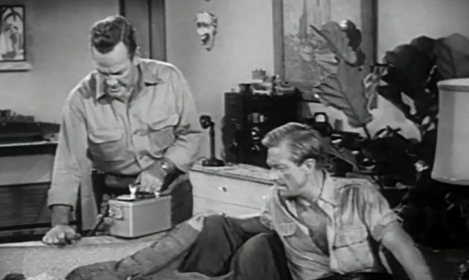 Conveniently situated at the bottom of the valley/quarry is a small single-story building, where former marine soldier and poor man’s John Wayne, Jim Maddison (Paul Birch) resides with his beautiful daughter Louise (Lori Nelson). As Jim has taken part in nuclear tests conducted just after WWII, he has predicted WWIII and the annihilation it would bring, and has spent the latter ten years preparing for it. He’s built his house in a valley surrounded by mountains filled with lead ore, since the lead ore prevents nuclear fallout from reaching his plot of land. He’s also built a store room with water and provisions for three people to survive two months, the period he calculates will be necessary for the nuclear fallout to disperse, and got himself a short-wave radio to listen for other survivors of the apocalypse. The third anticipated guest in his house would be someone called Tommy. It is never outright stated if Tommy is Louise’s brother or boyfriend, but all indications are that the two were lovers. However, Tommy has failed to show up, and is presumed dead.