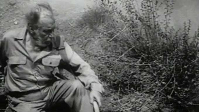 Next to the party is Rick (Richard Denning), the handsome hero of the movie – a geologist doing research in the mountains as the bomb struck. He is carrying a half-dead man with a nasty starfish-shaped radiation scar covering the entire right side of his face. It remains unclear if this is someone that Rick knew previously or if he simply picked him up along the way. But anyway, his name is Radek and he is played by Paul Dubov. Jim seems to have no problem with Rick joining their little survivalist camp, and Louise acts as if she knows Rick, creating a moment of confusion over whether Rick is the boyfriend (or brother?) that was mentioned before. But his name was Tommy, right? This means that Rick wasn’t part of Jim’s plans for survival, and certainly not Radek. The confusion isn’t lessened by the fact that Rick mentions his brother being killed by the radiation (wait – was that Tommy? Or is he talking about Radek? Or is this some third person?). To round out the main cast we finally get Old Pete (Raymond Hatton), an old gold prospector, stepping straight out of a western movie, and his faithful burro Diablo. Jim seems to figure that they are already double as many people as he can feed with his rations, so what does a seventh mouth matter at this point? But Diablo must stay outside.