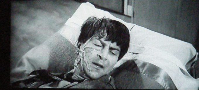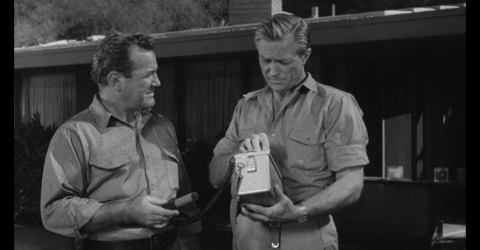 Only three days were spent on location – one in Griffith Park for forest scenes and house exteriors, one in the Bronson quarry and one at Sportsman’s Lodge. The interiors were shot in seven days in a a little studio called Sunset Stage, and about 80 percent of it was the living-room of Jim’s lodge, with a few short scenes in the sparsely decorated bedrooms, with not much more set dressing than a bed and a framed picture. To match the lodge that the studio had rented for the exterior shootings, the living-room had to have panorama windows. But that caused something of a problem, since they couldn’t afford to create any landscape outside the windows. Corman solved this by covering the windows with huge drapes, that were never opened – almost as if they were part of the protection against the radiation. Mike Connors tells Weaver in Eye for Science Fiction that in the final scenes, where’s he’s looking out the window to shoot Denning, he had to be extremely careful just to have a slight peek through the curtains, so that the camera wouldn’t see the empty studio behind them.