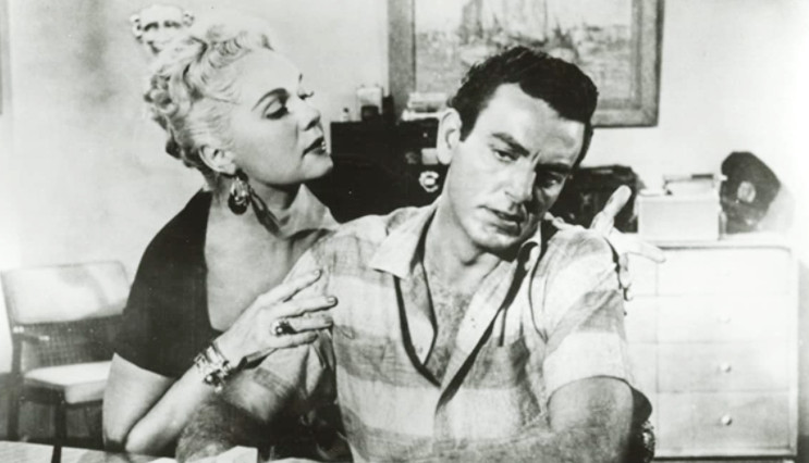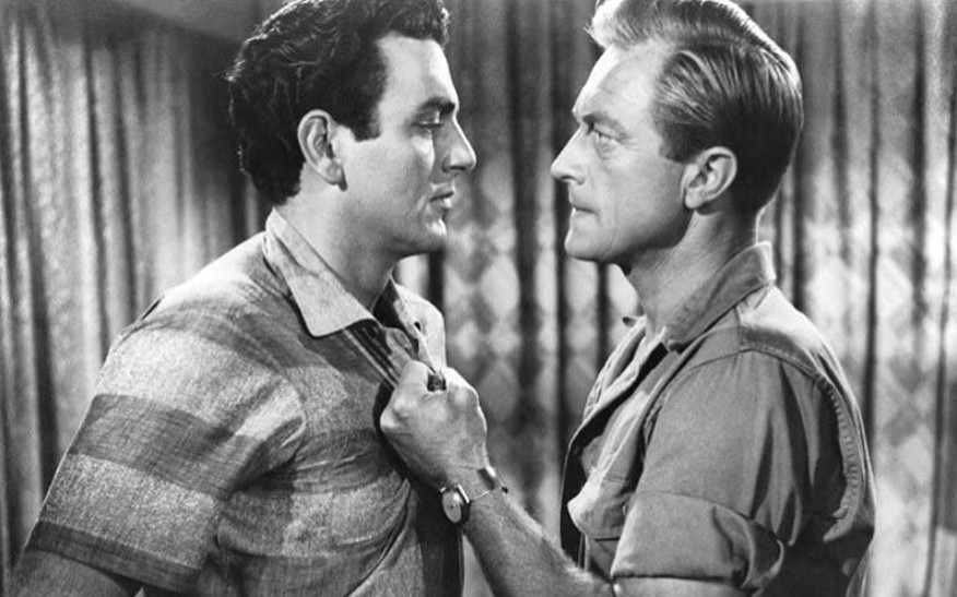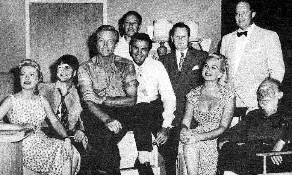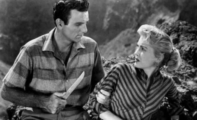 Mike Connors was at this point in his career billed as Touch Connors, his old football nickname. The Armenian-American Connors’ real name was Krekor Ohanian, a name producers naturally didn’t think fitted too well for a Hollywood star in the fifties. Ohanian was scouted by director William Wellman on the football field in the early fifties, and vied for the role of Tarzan after Johnny Weissmuller got too old for it. He lost it to Lex Barker, but an agency, and got signed with Metro-Goldwyn Mayer for a 90-day contract, just to scare Farley Granger who was being belligerent at the time – Ohanian never did an MGM film. But he got an agency, who changed his name. They thought about ”O’Hanlon”, but that was too close to another actor called George O’Hanlon, so for some reason it became Connors. ”Touch” had been his nickname in football, and Touch Connors was close enough to a name like Rock Hudson to be marketable. Connors tells Tom Weaver: ”I hated it from day one”.