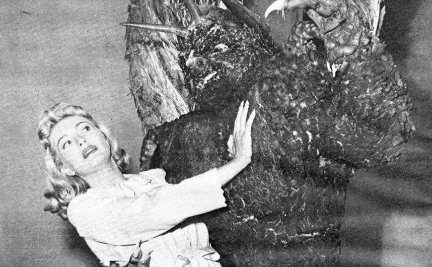 While Corman would have liked to officially direct The Beast with a Million Eyes himself, he wasn’t able to, since the minuscule budget meant he couldn’t do it as a union picture, which meant that he, a union member, couldn’t officially be involved – more than as ”executive producer”. This time he could pay union-sanctioned salaries, but the budget would still have been pocket money for a major studio. All exteriors were shot in Griffith Park and the Bronson Canyon outside Los Angeles, and several sequences were shot around the trout pond by the Sportsman’s Lodge. The Lodge’s restaurant kept the pond stocked with fish for meals, so by the time the restaurant opened, the film team had to be gone. However, according to Randy Palmer’s book Paul Blaisdell, Monster Maker Sportsman’s Lodge didn’t have a lunch menu, so the studio could work there through the morning and a good part of the afternoon. But that still wasn’t much, as a number of elaborate scenes had to be shot, including most of the final climax with the mutant, a romantic scene with Denning and Nelson, as well as a scene where Ruby and Louise go swimming. Alex Gordon, who was named executive producer for Golden State Productions, tells Tom Weaver that Adele Jergens was ”a trouper” in that situation, as she was having her period and didn’t want to go in the water. She asked Gordon if the scene could be shot some other day. Gordon, who by all accounts was the nicest person ever to inhabit Hollywood, had to tell her it was now or never, ”and she said , ‘Ohhhh, it’s fine, don’t worry about it. I’ll manage’. I was terribly embarrassed to do that to someone like her.”