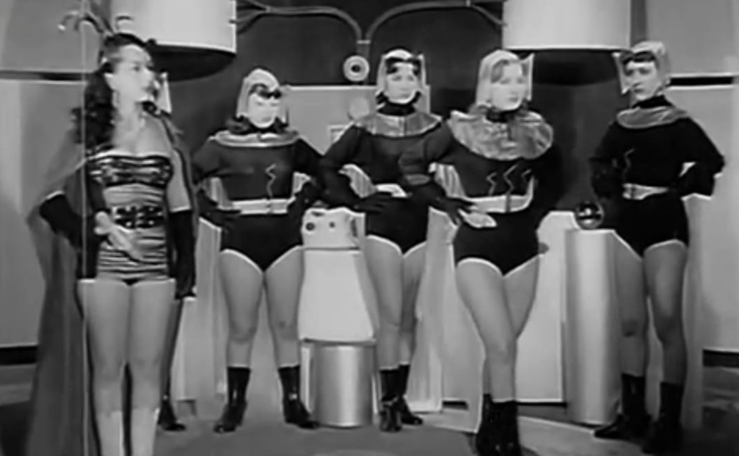Utku Uluer at Sinematik Yesilcam points out: ”This film is made for Turkish men”, and is intended to make fun of women’s liberation. This is a theme carried out in many sci-fi flicks of the fifties, fuelled by so-called “fifties values” that emphasised that a woman’s place was at home, taking care of a family, not as scientists, professionals or politicians. This was partly a backlash against the way in which women had taken the place in the workforce of the many men fighting in WWII, but also against a more general sexual, cultural and political emancipatory trend in the fifties. The women do come out on top in the film, but it’s the scantily clad, sexualised amazons that take the prize, while we are left laughing at the unmarried shrews at the nightclub. The long, pointless, but undoubtedly erotic belly dance sequences make it clear who the intended audience of this film was.