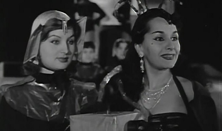 The silvery UFO opens, and out steps a boxy robot, followed by a group of women clad in leotards, mantles, broad, shiny collars and glittery head-pieces. And holding ray guns, naturally. The two men are captured, and the alien queen (Türkan Samil) explains that the men of their home planet have become extinct and they are now out looking for new men to marry. Turns out the women are all over 400 years old, thanks to a youth elixir. With money signs flashing before their eyes, the two journalists devise a plan to seemingly help the aliens to find new men, if they get one bottle of the elixir as payment, but in fact plan on selling it to the old, rich women at the club. The alien women agree to them going out to look for more men on their own, but in fact they only return to the club, to another bout of belly dancing.