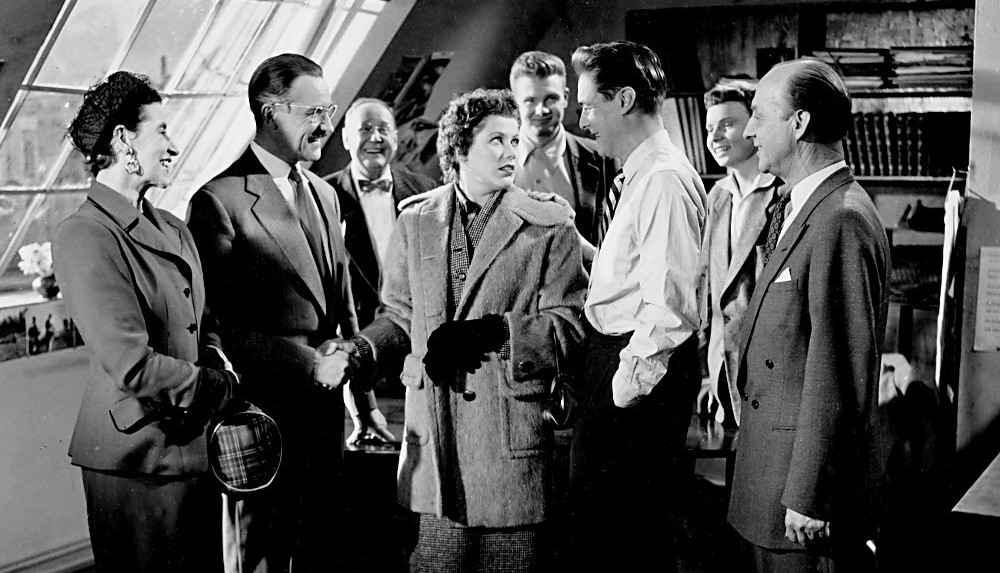 Technically there is not much to criticise in Kvinnens plass. Müller was a capable craftsman who later gained recognition with his social dramas. Kvinnens plass is crisply photographed in a style reminiscent of Hollywood screwball comedies, but with a touch of Italian neorealism. It moves along at a decent pace, some trimming might have done it good, but it doesn’t feel overlong at its 90-minute length. It’s clear this was a prestige film — it’s got some of the Norwegian film industry’s best talent in front and behind the camera and there seems to have been a decent budget for both studio and location shooting. I would personally have loved to see more of Oslo in the 50’s, though. Seeberg’s background in journalism gives it a sense of realism, as does the fact that the film team has had access to a working printing house. The dream sequence at the end also shows that Müller, cinematographer Per Jonson and production designer H.C. Hansen have a good grasp on special effects. The UFO landing looks better than in many low-budget Hollywood films of the era, the alien’s space suits are well realised and the effects with the shrinking Mr. Haugen are superbly realised with oversized props and furniture, as well as some neat composition shots. The music by the Norwegian Radio Symphony Orchestra director and prolific movie soundtrack composer Egil Monn-Iversen is perhaps a bit intrusive at places, but suitably dramatic at other. The acting is uniformly good, in the somewhat stylised manner of 50’s comedies. Inger Marie Andersen is no Oscar winner, but she has a charisma and natural directness, and the same kind of emotional openness as, for example, Ingrid Bergman, which translates so well to the screen. Lars Nordrum is wonderfully sweet in his role as the stay-at-home dad. Nordrum balances his performance well, so that it doesn’t tip over into caricature territory — he’s not making fun of the stay-at-home dad, which is why the film is as enjoyable as it is today. Also, with the exception of one grumpy nay-sayer, Mrs. Haugen’s male colleagues also don’t react in any way negatively towards her as a female reporter, but treat her as a normal member of the staff. Nordrum and Andersen have a good on-screen chemistry, which makes you invest in the characters and their relationship. On the whole, from a technical and artistic point of view, the film is well produced, and could as such be mistaken for a major Hollywood studio B programmer. It is certainly better in terms of production values than most Hollywood low-budget films I review on this blog.