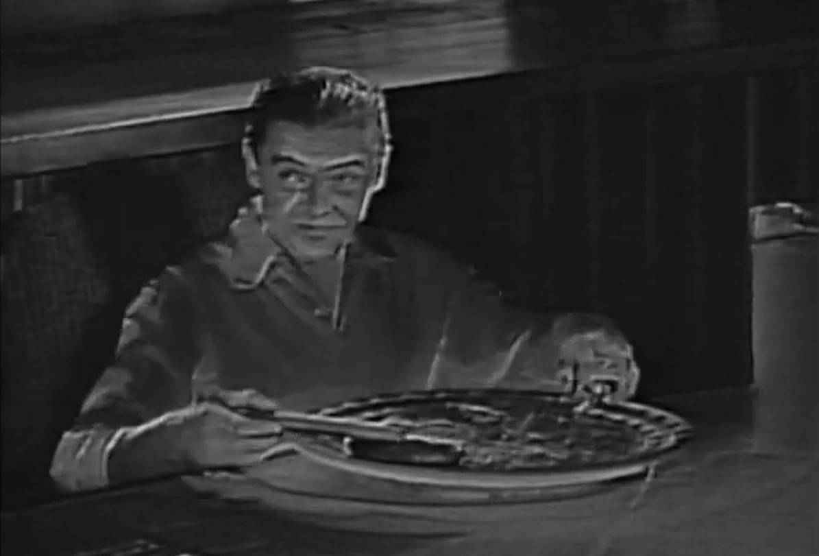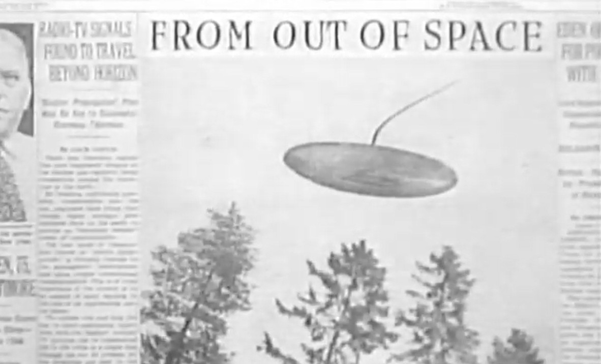 And at first things go smoothly. Mr. Haugen relishes his time with their son, happily taking care of the household, while Mrs. Haugen does long hours at the newspaper, building her career. But as “meetings” at the social hotspots and hotel restaurants with political and business hotshots start to drag on into the wee hours of the morning, she begins neglecting her family. For Mr. Haugen the last straw is when she forgets to come home for their wedding anniversary dinner, which he has meticulously prepared. When Mrs. Haugen returns in the middle of the night, she finds the remnants of what was supposed to be a candle-lit dinner and beside it, a framed copy of her famous UFO photo, taken on their honeymoon, smashed to pieces. Mr. Haugen throws her out of the bedroom. Sleeping on the couch, Mrs Haugen dreams of encountering two aliens in face-covering space suits, one man and one juvenile boy, and realises that her husband and son will become as alien to her as these Martians unless she changes her ways. Rushing home, she finds Mr. Haugen, emasculated and shrunken to the size of a milk carton, cheering her happily from his over-sized dinner table as he reads her articles in the monstrously large newspaper. Back at the office, the rolling plates of the printing press attack her in her office, steaming closer and closer, threatening to flatten her between the rolling pins as her deadline approaches. She screams in panic: “No! Stop! I don’t want make a career anymore! I want to go home to my family!”. She wakes up, rushes to the bedroom, looking for her shrinking husband beneath the sheets, unable to find him. But fear not, he was just in the bathroom, and he is full-sized again. As he picks her up in his arms, she exclaims: “From now on I will be your little woman, and you will be my big man!”