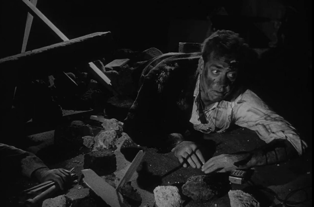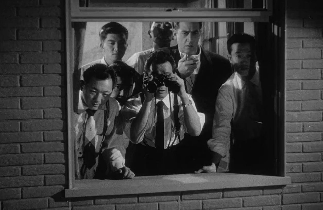 The film begins dramatically in medias res with American reporter Steve Martin (Burr) being brought to a makeshift hospital in Tokyo after having been buried under rubble. He is discovered by an old friend, Emiko (Momoko Kōchi), daughter of esteemed scientist Dr. Yamane (Takashi Shimura), and begins recollecting his experiences in a flashback, which takes up around half of the movie. The film then follows the original plot of Gojira rather faithfully, with several omissions, re-edits and a lot of changed dialogue, in order to fit Burr’s character into the plot. In some places, the Japanese dialogue is dubbed, in other places it is left as is, and “translated” for Martin by his host, security officer Tomo (Frank Iwanaga). And, as stated, in other places Martin interacts with the characters from the original film, either through clever cross-editing or by the use of body doubles. This goes on until Godzilla’s first major attack on Tokyo, when Martin is buried in the rubble. After this, the movie proceeds as a linear story, and Martin’s narration is changed from flashback mode to present mode, as he reads his reports onto tape for his editor. Godzilla’s final attack on Tokyo is narrated by Martin from an office window.