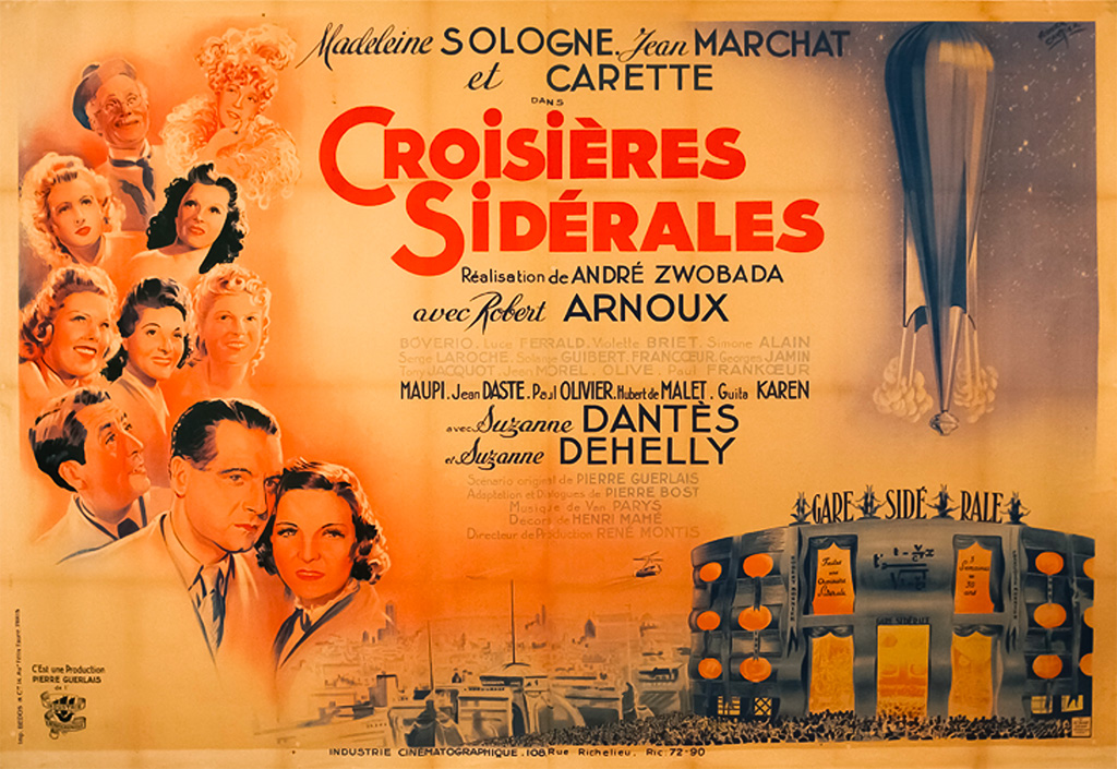 Croisères sidérales. 1942, France. Directed by André Zwoboda. Written by Pierre Guerlais & Pierre Bost. Starring: Madeleine Sologne, Jean Marchat, Julien Carette, Suzanne Dehelly, Robert Arnoux, Suzanne Dantès, Jean Dasté, Bourvil. Music: Georges Van Parys. Cinematography: Jean Isnard. Editing: Raymond Lamy. Set decoration & costume design: Henri Mahé. Choreography: Hélène Pierson. Produced by Pierre Guerlais for Industrie Cinématographique.