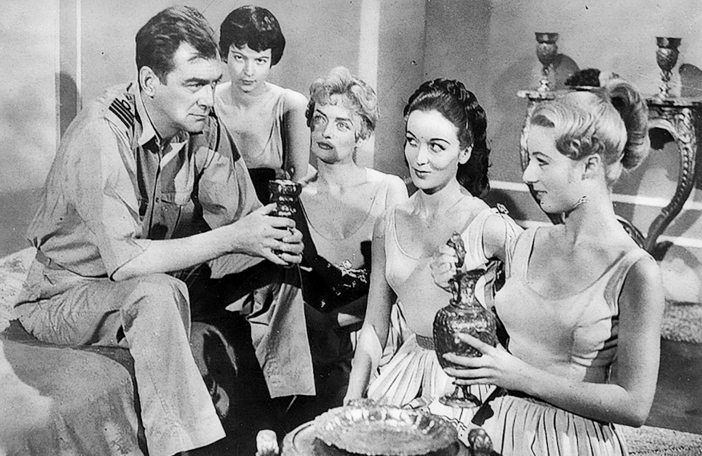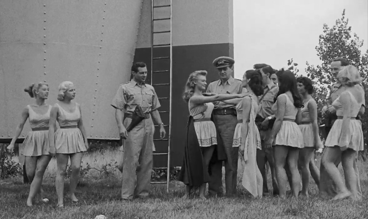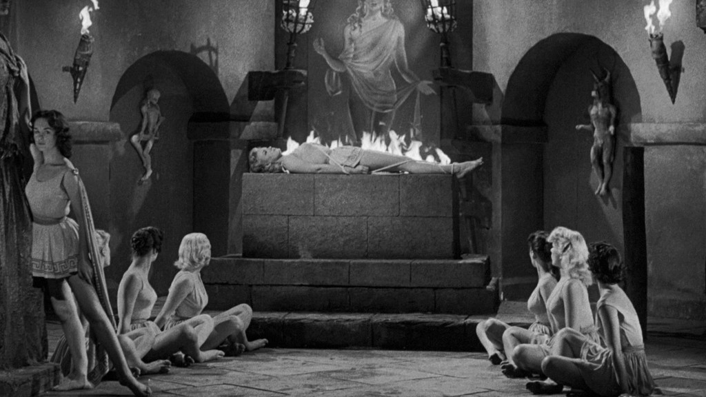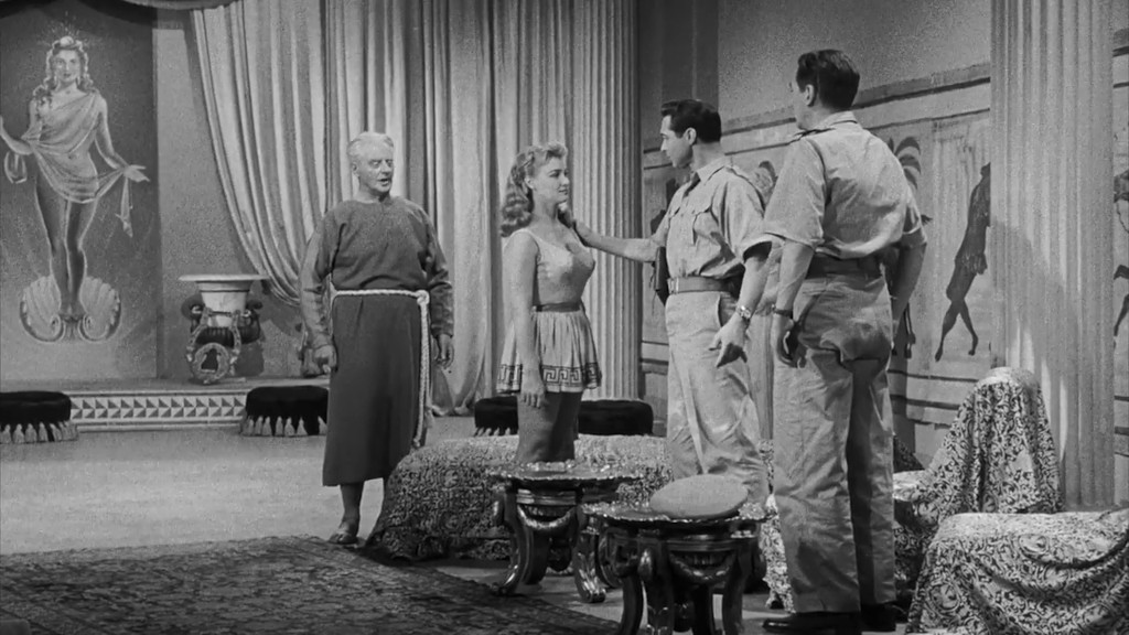 Now, the whole plot is oddly redundant. The five men aboard the rocket seem to be hoping to land on a moon inhabited by scarcely dressed maidens whom they can all give a friendly greeting from Earth. When their wishes are granted, they act as if they would rather be somewhere else. Disregarding the fact that Blair and Larson are given a sleeping potion and are locked up, the fire maidens don’t do any of them any harm, nor do they have any ill will towards the Earthlings. All they ask is that the men kill the monster and mate with the girls. For some reason, all five men vigorously protest to doing basically what they set up doing from the beginning, and end up doing exactly that, rendering the entire plot of the men being captured and imprisoned by the fire maidens completely moot. The same odd lack of logic surrounds the subplot of the fire maidens’ hatred for Hestia for trying to help Blair escape. At the finale of the film, Hestia is tied up and tormented by faux-Grecian interpretive dance, a prelude to her being burned at the altar for defying the laws of New Atlantis. However, once the monster is killed, all seems to be forgotten, and the girls happily chatter away as they untie Hestia, and upon learning Prasus has been killed by the monster, all happily choose her to be the new queen of Atlantis.