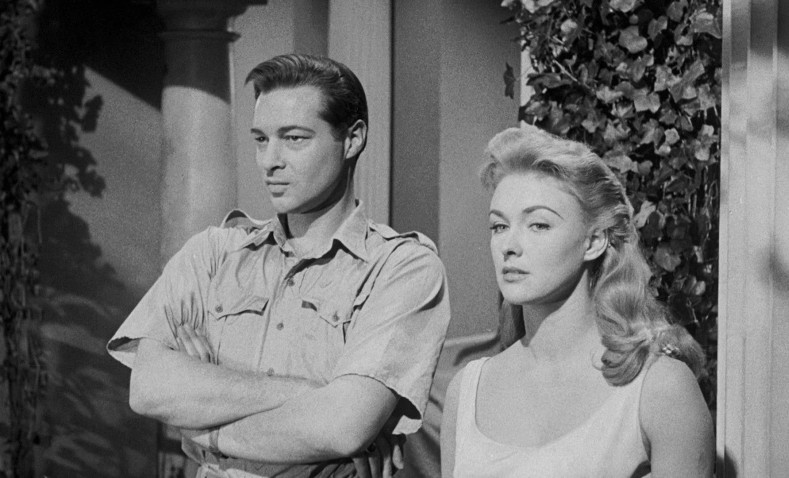 The male supporting cast is made up of seasoned character and bit-part players, none of whom will ring any bells with modern viewers. A few of them had rather successful careers in British TV. The second largest role of the fire maidens is played by feisty brunette Jacqueline Curtis, described in a Los Angeles Times article as “hopefully a new find”. However, Curtis’ screen career never took off, and she only appeared in a handful of bit-parts before withdrawing from the business in 1958. Elegant, blue-eyed Jan Holden was a stage actress who entered the movie business in 1952. On the big screen she was mostly consiged to bit-parts but she fared better in TV, holding down a few recurring roles and even starring in one short lived series. Holden worked steadily in both film and TV up until the early 80’s. Pretty Kim Parker’s film career lasted little more than five years, one of many young women hoping to make it in the business, only to find opportinities for women in film are fewer than men’s, and that managing the crushing 50’s expectations on being a wife and a mother was hard enough even without navigating a fickle and uncertain film career. Parker did have time to appear in W. Lee Wilder’s SF horror film The Man Without a Body (1957, review) and even played the lead in The Fiend Without a Face (1958, review). Also appearing in the latter was Shane Cordell, who started her career as a switchboard operator at the BBC, a so-called “hello girl” in the early 50’s, but quickly became a very popular model and a bit of a film starlet, although the evening papers were more interested in her bust size than her acting, and she was confined to pretty bit-parts.