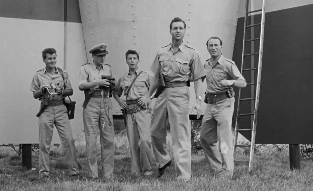 Look at the well-mowed lawn on the moon of Jupiter! Left to right: Rodney Diak, Paul Carpenter, Harry Fowler, Anthony Dexter and Sydney Tafler.