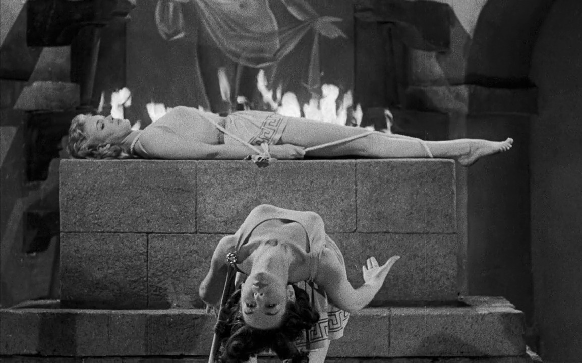Susan Shaw about to be sacrificed. Jacqueline Curtis leaning against a column to the left.