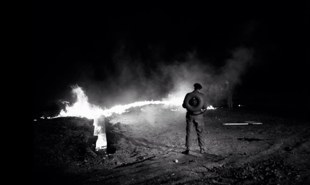 According to Bill Warren, Jimmy Sangster’s original script described the monster as being “made up of millions of writhing worm-like segments”, capable of slipping through small cracks and forming up again on the other side of a mesh fence. This ability is described in the film, but never shown on screen. Even if the movie had had a significantly larger budget, the effects described in the original script would have been extremely challenging to achieve with the technology of the day. After all the buildup, the revelation of the monster is a bit of a disappointment, as it turns out to be what some commenters have described as “a heap of mud”, although my first thoughts go to slow-moving lava. If one stops to think about it, the immediate danger here isn’t all that great as the blob comes rolling toward the small town of the setting, as most townspeople could easily escape at a leisurely walking pace. Still, Norman is able to drum up a couple of good dramatic scenes of people seeking refuge in a church, as the radioactive monster bears down on them. And, of course, it isn’t the immediate danger that is the focus of the final showdown, but the fact that if the monster reaches the nuclear test site, it is going to grow exponentially.