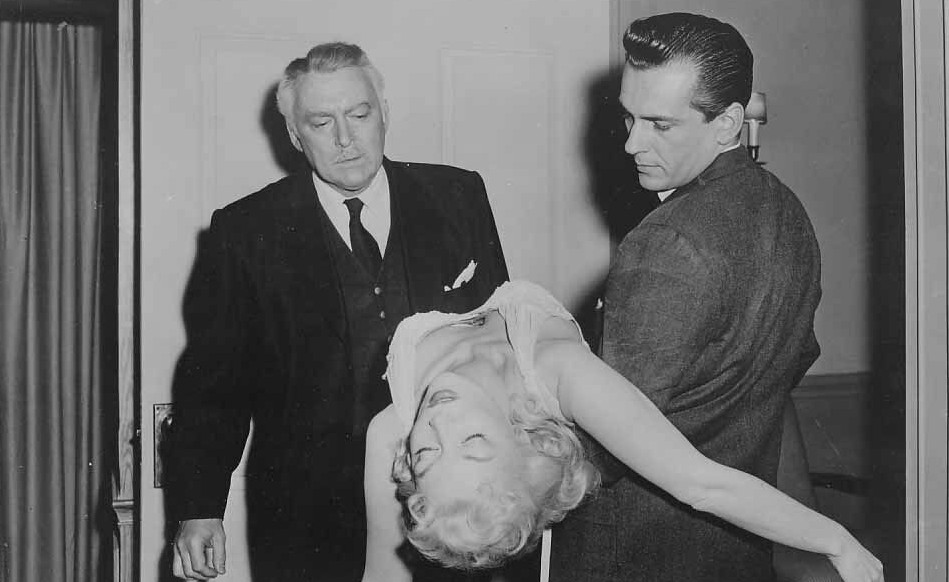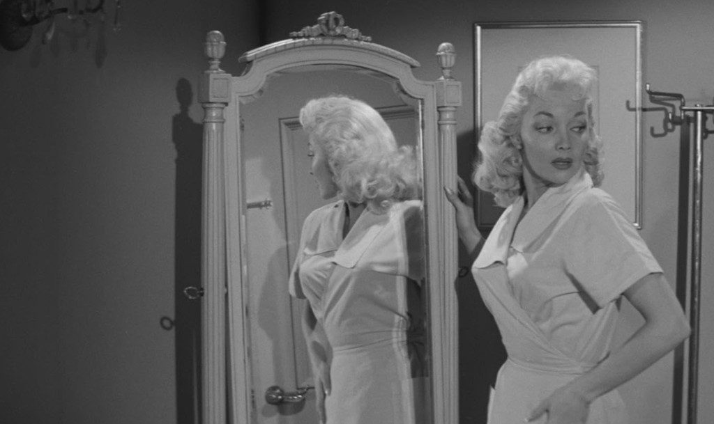 Experimenting with fruit flies, Dr. Dan Scott (Jack Kelly) has come up with a new serum, which he hopes will be a cure-all for all disease, utilising every organism’s capacity to self-heal (“like a lizard shedding its tail and growing a new one, or a chameleon changing its colours in self-defence”). His friend, Dr. Richard Bach (Albert Dekker), the head of Grand Mercy Hospital, is sceptical about letting him conduct human experiments on his patients, but relents when he admits Ms. Kyra Zelas (Mari Blanchard), a young woman dying from incurable tuberculosis. Ms. Zelas, a woman apparently with a past in the shadier walks of life, receives the serum, and is immediately cured. Not only that, but she also becomes practically invulnerable, as her wounds heal instantaneously. Scott and Bach set her up at the two bachelors’ lavish mansion in order to keep her under observation. But on her way to his place, she visits a dress shop, slugs a man with a vase and steals his money to buy herself a new wardrobe. In order to evade the police, she uses her new powers to change her hair from black to blonde, and then goes on a shopping spree. When Scott and Bach find out, they suspect that the serum has caused Zelas to also undergo a personality change — that Scott has not saved a life, but instead created a new life, the life of something inhuman.