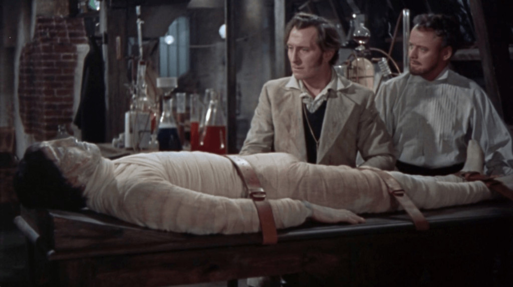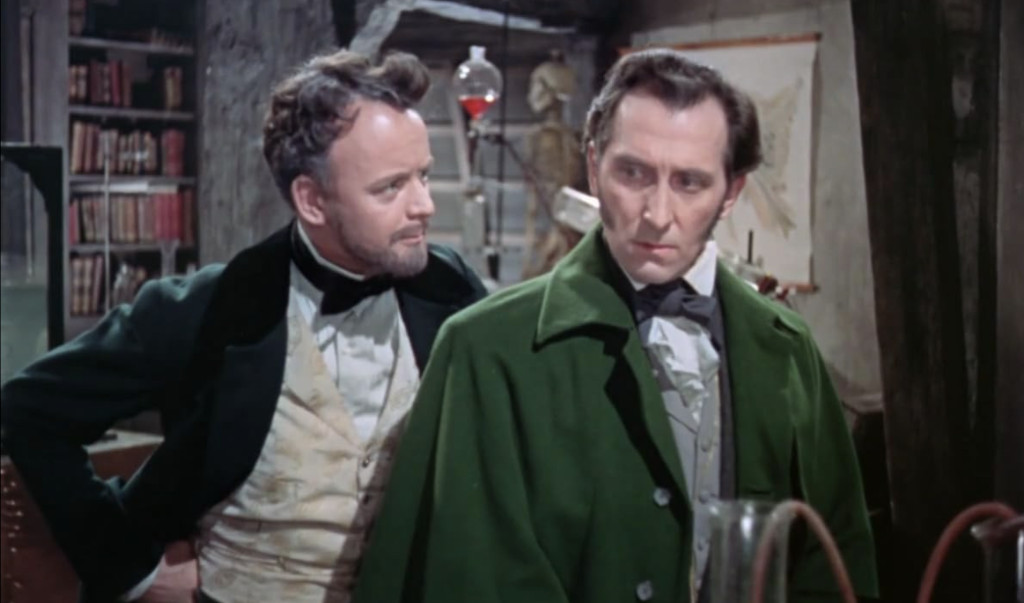Cushing excels in a role that he deliberately sought out. According to Warren, Hammer planned to approach Cushing for the film, but hesitated, as they weren’t sure the refined television star would accept. Cushing beat them to the point. He loved James Whale’s 1931 film, and as a young actor in Hollywood in the late 30’s was helped by fellow Brit Whale, and appeared in his 1939 movie The Man in the Iron Mask. When he heard Hammer was remaking Frankenstein, he immediately expressed interest in playing the titular character.