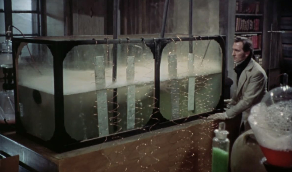 As a young boy (Melvyn Hayes), Frankenstein excelled in school, and after graduating, continued his studies under his mentor Paul Krempe (Robert Urquhart). Master soon became assistant, as Frankenstein surpassed Krempe in both knowledge and passion, especially for the secrets of life. After successfully resuscitating a dead dog, Frankenstein convinces a reluctant Krempe to help him not only bring back the dead, but create new life – a new human being. Work is slow, as Frankenstein gathers body parts from graves and charnel houses, and Krempe gradually grows a distaste for the whole business. This isn’t lessened when Frankenstein’s cousin Elizabeth (Hazel Court), his betrothed since childhood, arrives, announcing she is now ready for marriage. Despite his long-lasting affair with housekeeper Justine (Valerie Gaunt), Frankenstein rejoices. Not that marriage is a bliss for Elizabeth, as her husband spends all days tinkering away in his locked lab, with the assistance of Krempe. Finally the day comes when Frankenstein is to insert the brain into his creature, and tells Krempe it will be the brain of a genius. Not long thereafter, Frankenstein invites the venerable Prof. Bernstein (Paul Hardtmuth) to dinner, only to push him off a balcony, to his death. When visiting his crypt after the funeral, Frankenstein is interrupted while carving out Bernstein’s brain by Krempe, who has realised what his old adept is up to and vows to stop the experiment. In the kerfuffle, the brain is damaged, but Frankenstein soldiers on nonetheless. And not long thereafter, Frankenstein turns on his machine, and up rises a hideous giant of a man (Christopher Lee), and his first action is to try to strangulate Frankenstein, who is rescued in the last minute by his old friend Krempe.