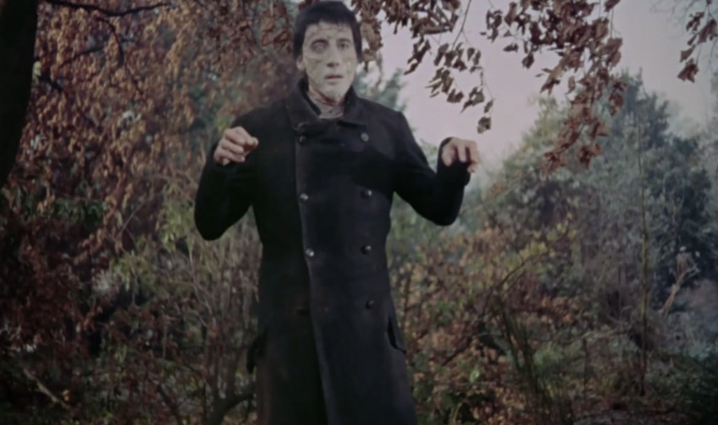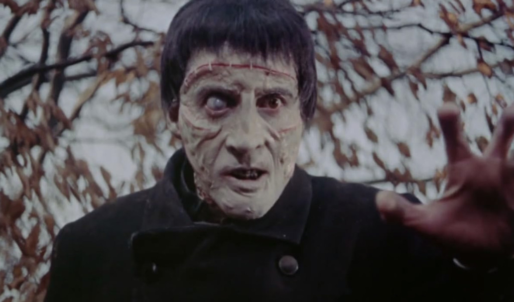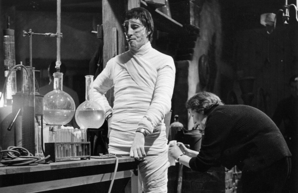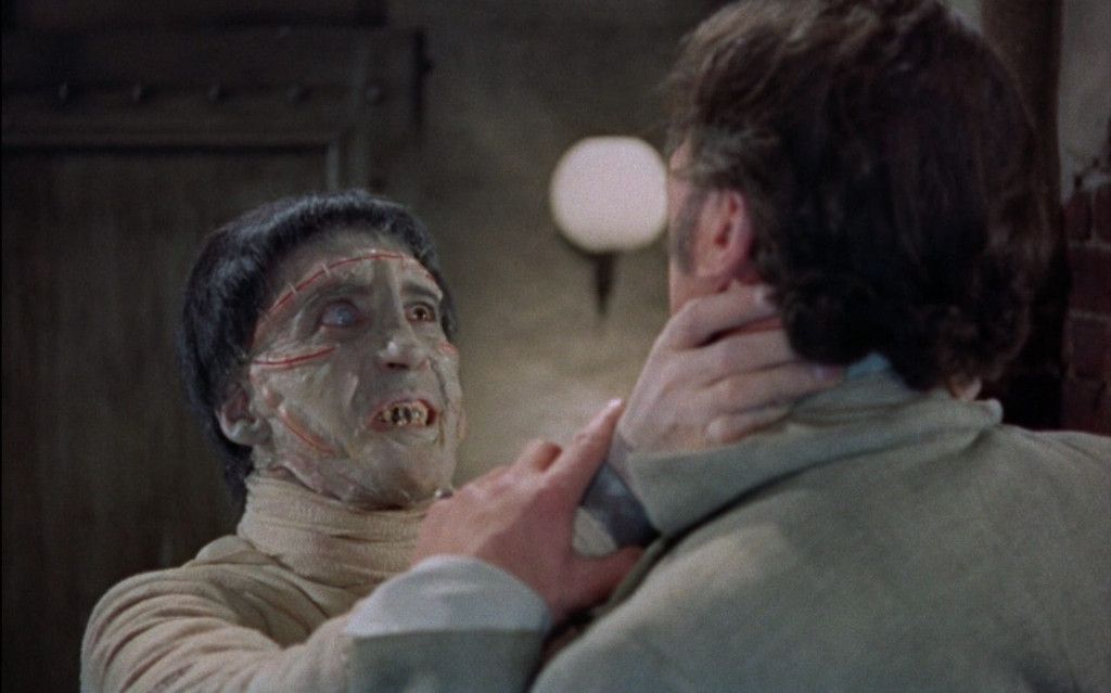 Hammer was consciously trying not to emulate Jack Pierce’s legendary makeup for Boris Karloff, and makeup artist Philip Leakey also dropped the famous flat head and the gaunt-looking cheeks, instead opting for a gorier look for Christopher Lee, with a greyish green face that almost looks like it’s perpetually melting. It’s not a particularly original makeup, but looks like any number of other grotesque B-movie monsters. According to one source, Leakey had tried to create a makeup from a cast of Lee’s face without success, and was forced to improvise the final makeup straight on Lee a day before filming began. Lee doesn’t have much to work with, as the creature’s time on screen is relatively limited and does little more than shuffle around and strangles people, but Lee’s skilful pantomime brings it to life, in particular in the scenes after its “brain surgery”, when it appears frightened and forlorn, chained to the wall. In Lee’s portrayal, its seeming difficulty to control its own limbs lends it a tragic air.