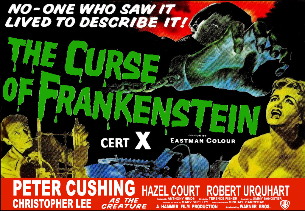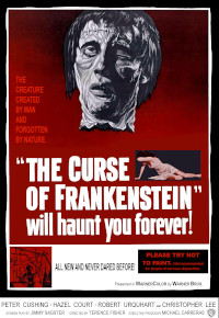 The Curse of Frankenstein. 1957, UK. Directed by Terence Fisher. Starring: Peter Cushing, Robert Urquhart, Hazel Court, Christopher Lee, Valerie Gaunt, Melvyn Hayes, Paul Hardtmuth. Written by Jimmy Sangster. Based on the novel Frankenstein by Mary Shelley. Music: James Bernard. Cinematography: Jack Asher. Editing: James Needs. Production design: Bernard Robinson. Costume design: Molly Arbuthnot. Makeup: Philip Leakey. Sound: Jock May. Visual effects: Les Bowie. Produced by Anthony Hinds for Hammer Films.
