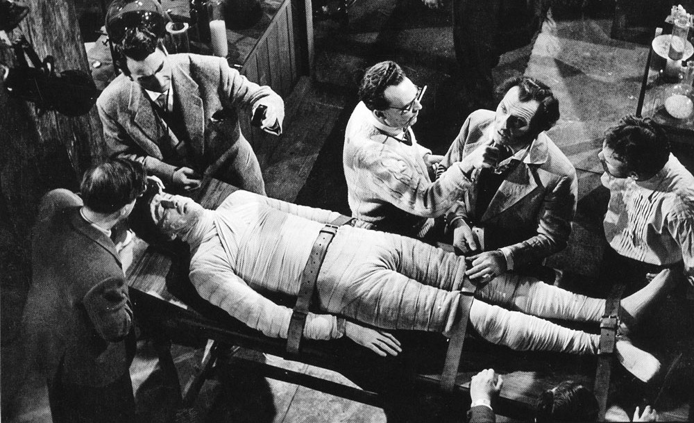 Born in 1904, director Terence Fisher was a late bloomer. After working as a merchant sailor, he decided sea life wasn’t for him, and sought out the movie business. In 1934 he applied to the J. Arthur Rank Studios’ editing deparment, and to his great surprise, was accepted. He got his first editing credit in 1936, and edited around 20 films before he graduated to direction in 1948. He made both A movies for Gainsborough and supporting films for smaller companies. In 1951 he did his first film for Hammer, who liked him, and he became a staple at the studio. Fisher disliked science fiction, but nonetheless made three early SF entries for Hammer, Stolen Face (1952), Four-Sided Triangle (1953) and Spaceways (1953, review). During the 50’s Fisher was a respected workhorse, but had no great name recognition, nor was he particularly defined by any specific style or genre. With the success of The Quatermass Xperiment (1955), it was Val Guest who had become the star director of Hammer. A probable reason as to why Guest didn’t direct The Curse of Frankenstein might be that he was busy with Quatermass 2 (1957), the subject of our next review.