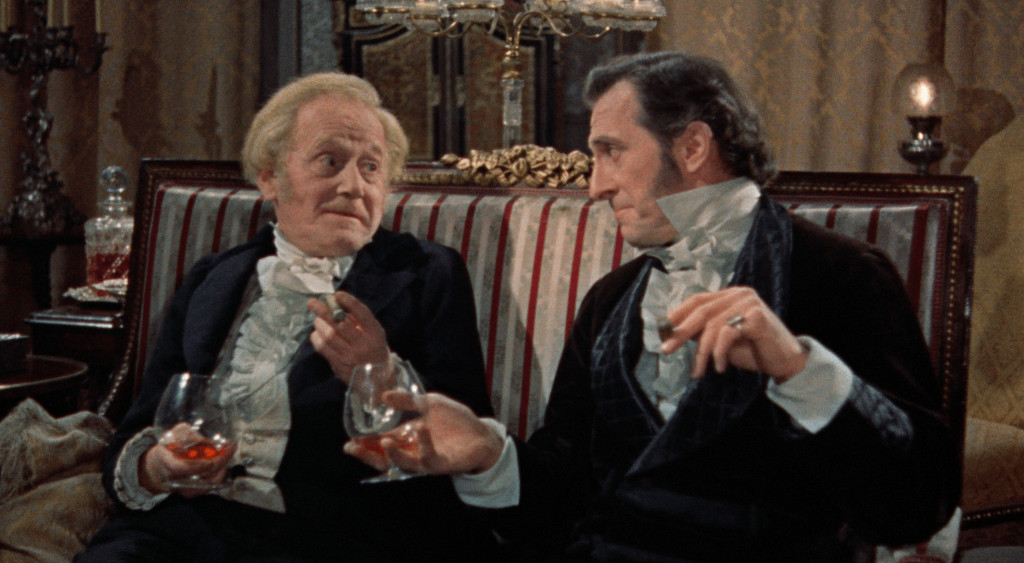 During his early career, Cushing acted twice in the same films as Christopher Lee, but the two never met before The Curse of Frankenstein. Born in 1922 of minor nobility with Italian family roots, Lee worked menial jobs before joining the war effort in 1939, originally as a volunteer assisting my home country Finland against the Russians during the Winter War. He and the other British volunteers were put on guard duty a safe distance from the border and returned home after two weeks. Lee served in the RAF from 1939 to 1946, leading troops in Africa and Italy, and after the war put his wide language skills to use in hunting down Nazi war criminals. In 1947 he joined the Rank organisation as an actor, and acted in numerous films and TV shows in the late 40’s and 50’s, but struggled to find proper roles because of his height. As such, his thankless casting in The Curse of Frankenstein — a role he got because he was tall and cheap — turned out to be a career-defining “bit-part”. Horror of Dracula launched him into international fame, one that would be both a curse and a boon.