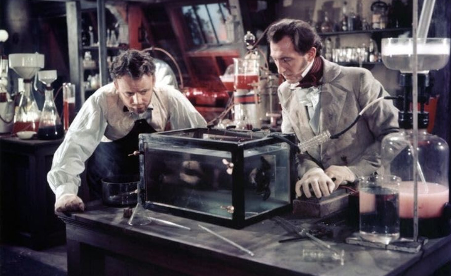 In fact, the film leaves out the creature’s story and point of view entirely – one of the most important aspects of Shelley’s novel. The Curse of Frankenstein also adopts Universal’s decision to make the creature a mute brute, a hefty departure from the book, where it is eloquent, compassionate and learned (true, this trope was present before the Univeral film, read more on the development of the Frankenstein mythos in my review of the 1931 movie). Sangster, whether or not he had seen the 1931 movie, falls back on its tropes. For example, the scene in which Frenke damages the brain is a throw-back to the assistant Karl (not Fritz) dropping the intended brain and instead taking an “abnormal” brain to Victor. In a weird way, it is almost as if filmmakers wanted to absolve Victor by having his assistants bungle the brain part. On the other hand, Hammer’s Victor actually knows the brain is ruined, but uses it anyway.