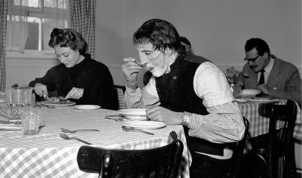The actor playing young Frankenstein is Melvyn Hayes, a former chilf actor who would go on to some TV fame in the Uk for portraying the drag artist/soldier in the BBC WWII sitcom It Ain’t Half Hot Mum (1974-1971). He later embarked on a successful career as a voice actor. German-born Paul Hardtmuth portrays the scientist whose brain ends up inside the Creature. Character actor Hardtmuth showed in the SF movies Highly Dangerous (1950, review), Timeslip (1955, review), The Gamma People (1956, review) and The Curse of Frankenstein (1957).